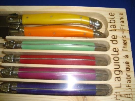 Set of 6 French multicolor Laguiole steak knives designed by Jean Dubost with its "Authenticity Certificate" These knives are dishwasher safe (acrylic handles with 6 different colors...see photo). DUBOST COLAS PRADEL was created in 1920, by Pierre DUBOST and his wife Marcelle COLAS PRADEL.Dubost Colas Pradel is situated in Viscomtat, a mountain village 15km from Thiers, the capital of french cutlery.Ever since its foundation in 1920 by Pierre Dubost and his wife Marcelle Colas Pradel, the company has passed down a family tradition of fine workmanship and high quality products.It is now in the hands of the third (Philippe Dubost) and the fourth (Alexandre Dubost) generations.The company has grown in notoriety due to being attentive to the changing needs of consumers, and its faithful presence at international fairs since 1962.Since its creation Dubost Colas Pradel has been in a perpetual development.Despite having started in a small workshop, production grew rapidly under the inspiration of Jean Dubost, the founder's son, who gave his name to the famous flatware line and the world renowned kitchen knives.Quality is an integral part of the company policy.Products are quality controlled at each step of production, with care to assure good workmanship, in order to provide consumers with pleasure and the assurance of long lasting use.Ref #97131