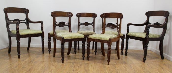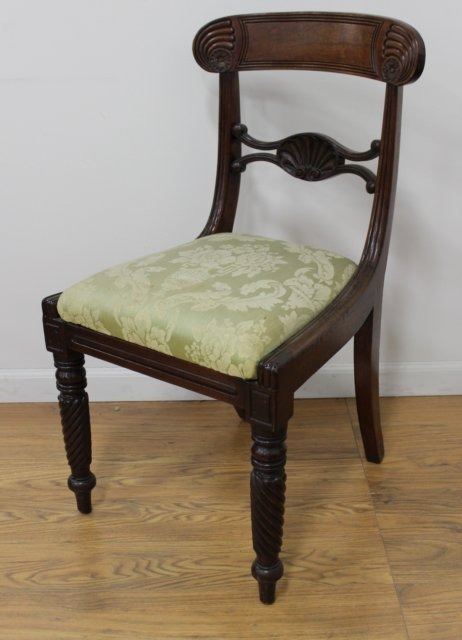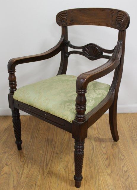 Early 19th century. Upholstered in celadon silk damask. Including 2 armchairs. Approx. 34 1/2" H x 18 1/2" W x 20" D. From the estate of Mark Zulli, antique collector and dealer for 50 years. (6131)