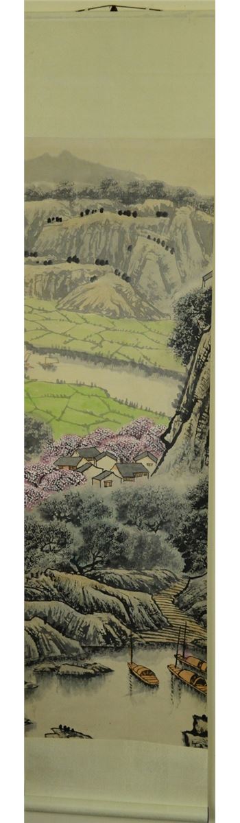 Set of 8 Paintings continuous village scene, Chinese watercolour on eight paper scrolls, signed Song Wenzhi (1919-1999) with two artist red seals. 140 cm x 45 cm each.