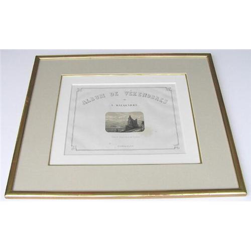 Included in this listing are eight (8) framed lithographic prints from the folio entitled "ALBUM DE VEZENOBRES par A. MAUGENDRE ruines de l'ancien Chateau de Vezenobres". At the bottom of the title page it reads "Imp Lith. Auguste Bry, r. du Bac, 114, Paris." The author/artist is no doubt Auguste Maugendre (1809-1895) and the lithographer or publisher was Auguste Bry of 114 Rue du Bac in Paris. These eight prints (seven architectural/landscape prints plus title page) represent the entire and complete prints from the folio. The Chateau de Vezenobres is located in the South of France near Nimes and Montpelier. Condition of each page is very good. There is some limited foxing and water damage on some prints, and one print has a tear in the lower left corner. Most pages are relatively flat but there is some rippling on some of the pages. Each gold leaf frame features a double layer of matting, plus gold leaf decoration and top linen layer. Frames measure 22 7/8" by 19 7/8" by 5/8". Area of the prints exposed measures 10 3/4" by 9".