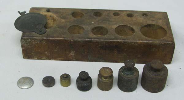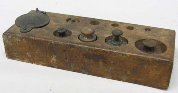 Set Antique Scale Weights. Wood holder measures approx. 5 3/4'' x 2 1/4''. Buyers Pay Actual Shipping and Handling Charges(see terms and conditions for more information).
