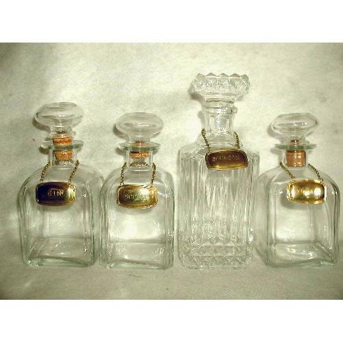 Set of four weighted cut glass liquor decanters displaying brass plates on chains for the contents of each with engraved names for Bourbon,Gin,Scotch and Vodka. The larger of the set has beautiful cut work ribbing on all sides of the body with a square facet cut stopper.The other three square with rounded shoulders, round glass top and cork stopper. All in excellent condition as well as the brass plates with chain. The tallest measures 9.75H X 3.50D X 3.75L,the shorter three 8H X 3.5L X 3.5D.