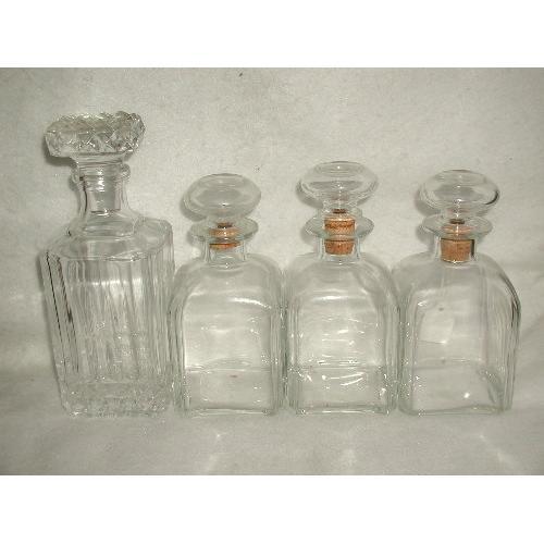 Set of four weighted cut glass liquor decanters C.1920. The larger of the set has beautiful cut work ribbing on all sides of the body with a square facet cut stopper. The other three square with rounded shoulders,round glass top and cork stopper. All in excellent condition. The tallest measures 9.75H X 3.50D X 3.775,the shorter three 8H X 3.5L X 3.5D.