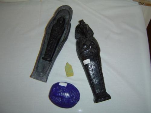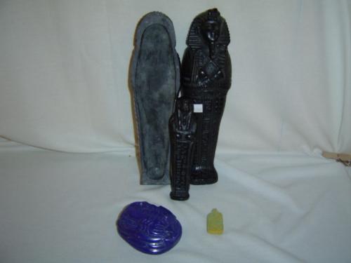 This three piece collection includes a 9.5" King Tut Sarcophagus w/ Mummy, a 3.25" Lapis Scarab and a 1.5" Egyptian Clay Bead.