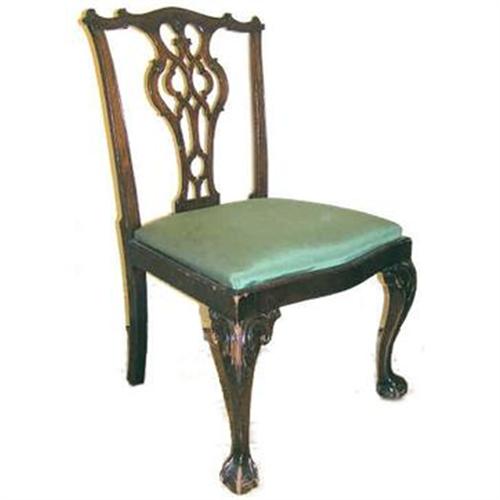 This set of six (6) George II Chippendale style dining chairs in mahogany was purchased at auction at Doyle's of New York on 2/22/89 in lot 351 for $3,200. (Copies of the auction catalog cover and appropriate page wll be sent following purchase.) Age is unknown. All chairs are structurally sound. Finishes appear to be original. Overall condition is fair to good, with scrapes and considerable wear at the knees and feet, and at the ends of the arms on every chair. Front claw on a few chairs is worn down or broken off down to the ball. Our closeup photos below are representative of the overall condition of the set. Chairs measure 38.5" high, 23" wide; 20" deep. Seats measure 22.5" wide and 17" deep. Seat height is 19.25". They feature exceptional carved center splats and crestrails, acanthus carved designs on arms, and richly carved cabriole legs with ball and claw feet. Simple green upholstery is about 20 years old. There are stains throughout the set and we recommend reupholstery. Available for inspection by appointment on the upper west side of Manhattan in New York city. Thanks for visiting. Please let us know if you have any questions or comments.