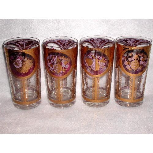 Set of 4 C.1920 10 oz. glasses or tumblers have beautiful gold embossed leaf and fretwork design surrounding them. Gold and purple fruit in each of the three upper circles with the background shaded in purple within the circle. The interior of the fretwork is lavender creating an elegant hue from the outside. Weighted bottoms. Still in excellent condition. Measure 5.75H X 2.75W X 2.75L.