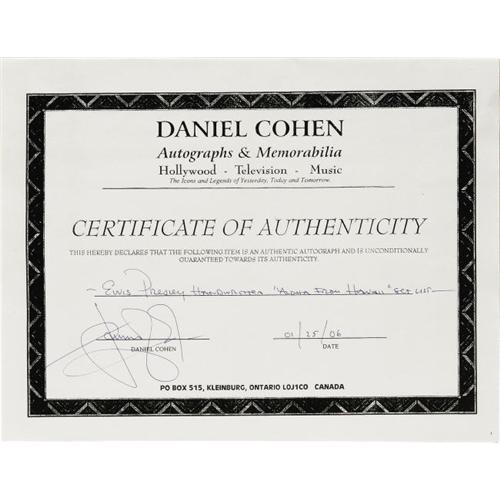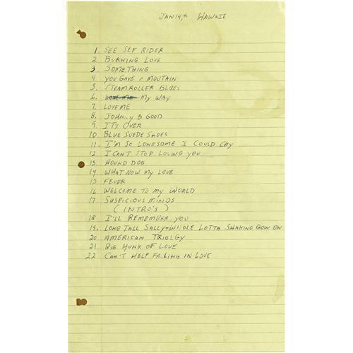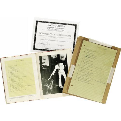 <B>Set List from the "Aloha from Hawaii" TV Concert Handwritten by Elvis Presley.</B></I> An original set list for the January 14, 1973 satellite concert from Hawaii (seen live by a billion people worldwide, and on delay by 500 million more), completely handwritten by Presley on a sheet of yellow 8.5" x 13" notebook paper. Included are letters of authenticity from stage director Charlie Hodge and stepbrother David Stanley, as well as a copy of the 2002 book "Elvis in Hawaii" by Jerry Hopkins. A rare Elvis treasure. <I>Accompanied by a COA from Daniel Cohen, noted authograph authenticator.</B></I>