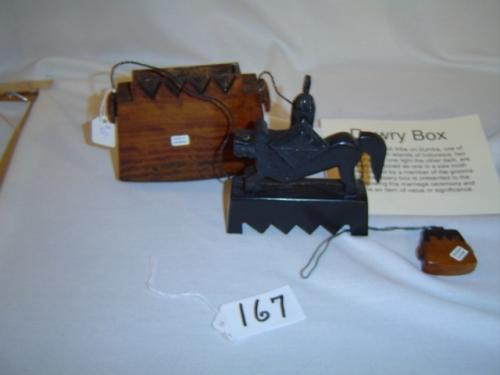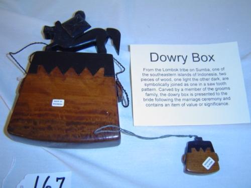 From the Lombok Tribe on Sumba, one of the southeastern islands of Indonesia, two pieces of wood, one dark and the other light, are symbolically joined as one in a saw tooth pattern. Carved and polished by a member of the grooms family, the dowry box is presented to the bride following the marriage ceremony and contains an item of value or significance. This Dowry Box, 7.25"h X 4.75"w X 1.13"d, has an unusual adornment of a warrior on horseback. The style of the Mini Dowry Box is more common, (1.5"h X 1.7"w).