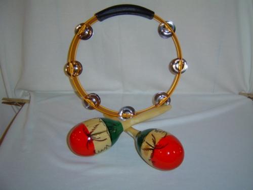 Professional metal 12" tambourine, two Mexican hand-carved maraccas.
