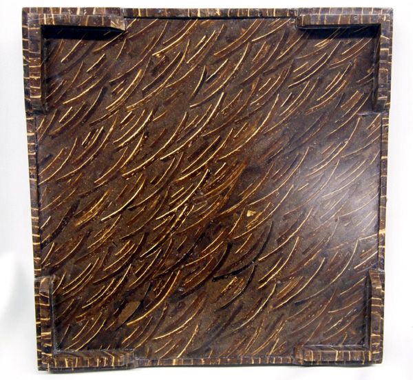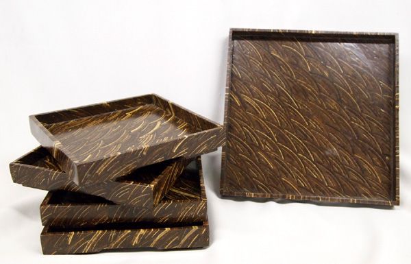Set Natural Pressed Coconut Shell Snack Trays and Serving Dish. Made from cross sections of pressed coconut shell. Includes a serving tray which measures approx. 8'' x 8'' and 4 nesting smaller trays each measures approx. 6'' x 6''. Perfect set for appetizers or sushi! Hand crafted in Java, Indonesia.