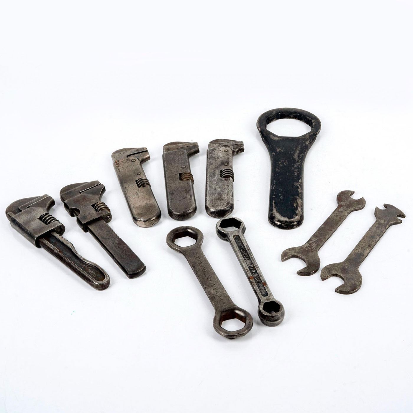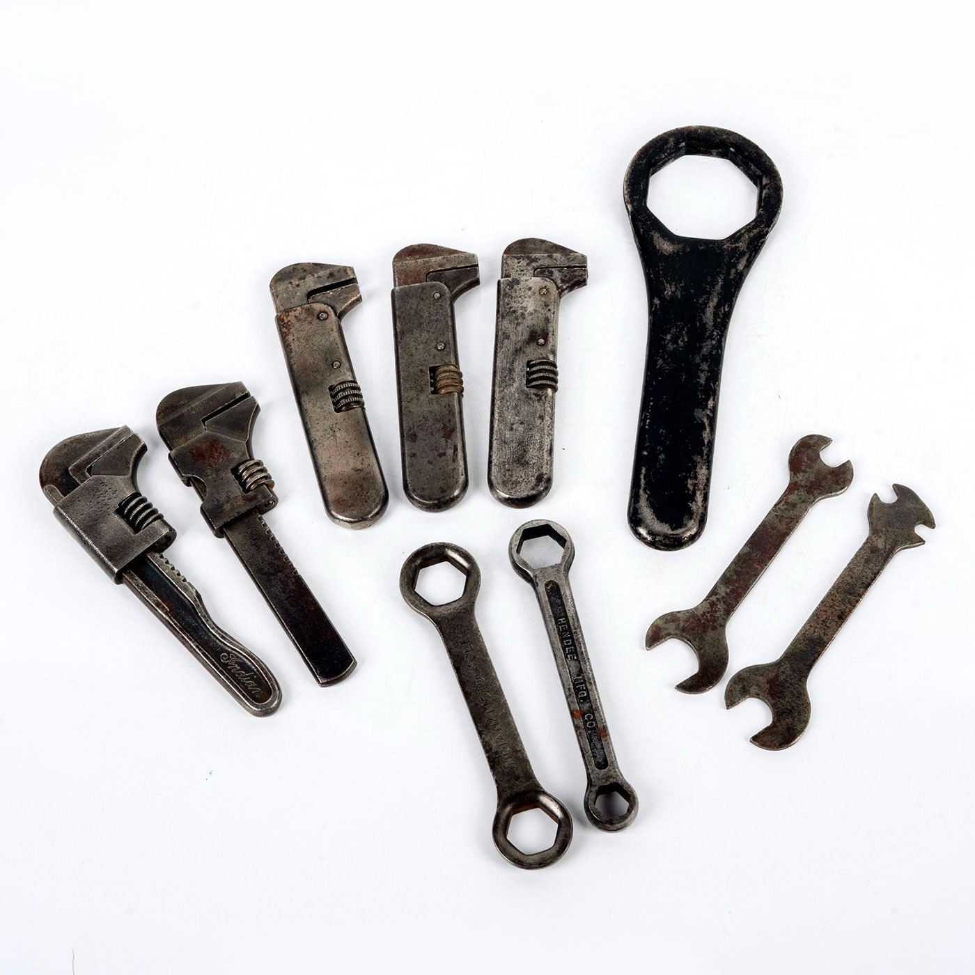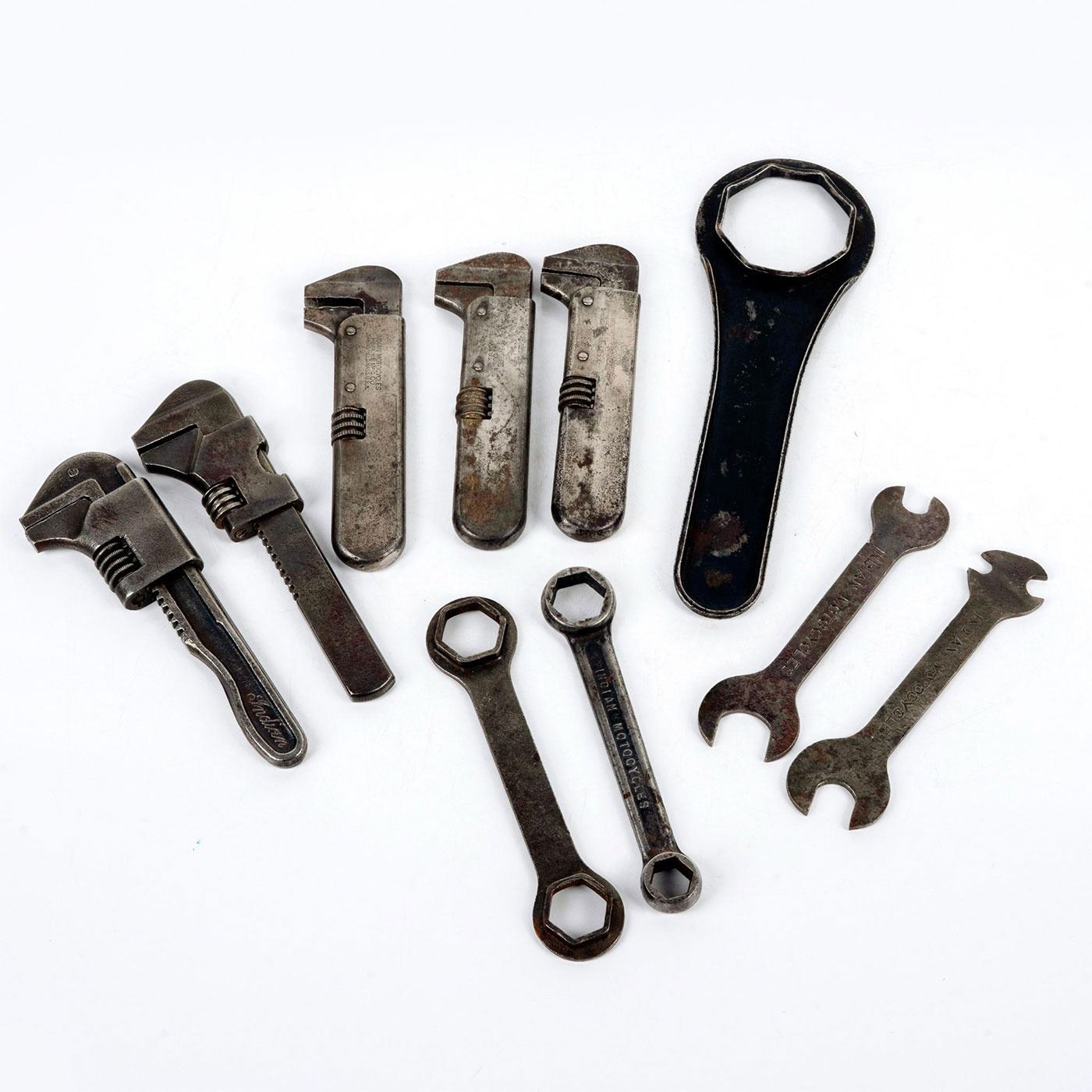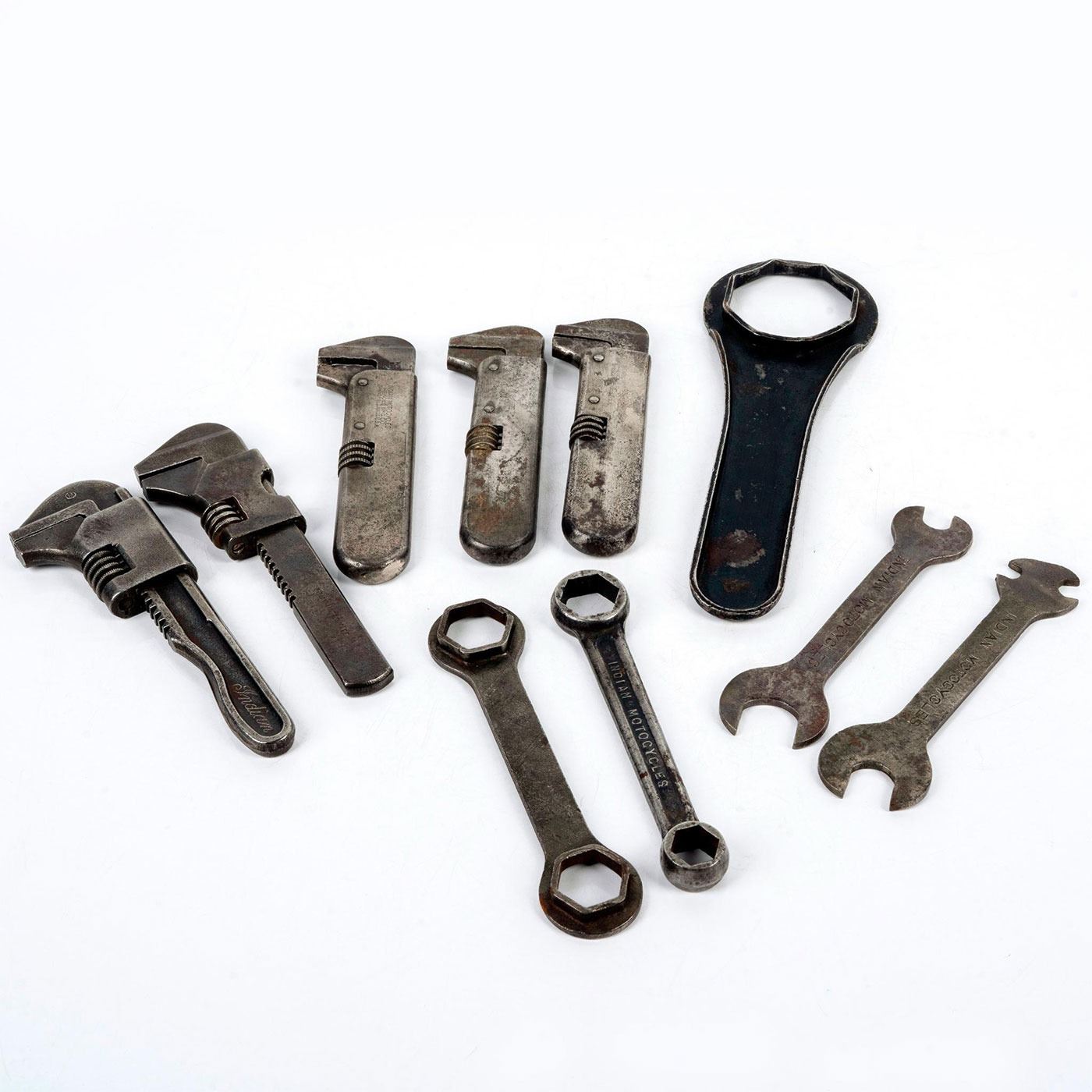 1920s set of motorcycle tools including crescent wrenches and adjustable monkey wrenches. 9 out of 10 pieces marked Indian Motocycles. Largest piece measures 9.75"L. Automobilia