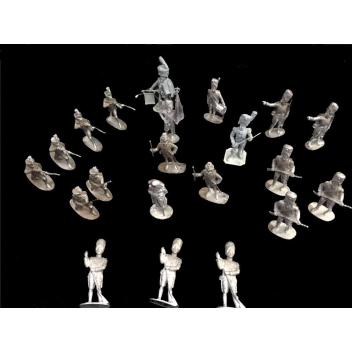 Vintage grouping of 21 toy soldiers, including French Imperial Guard & British. One marked on the bottom "French Grenadier 1812, another marked "Chasseurs A Cheval Tumpeter 1812" & one stamped "Valiant" on the bottom. Four soldiers kneeling with rifles, two standing firing rifles, ten standing with rifles, one with flag & one with drum.