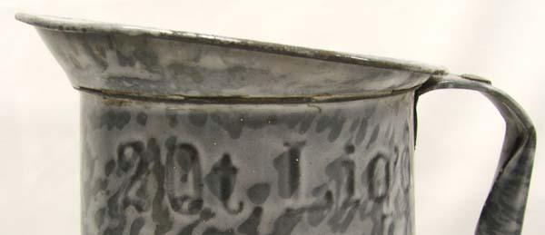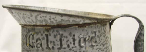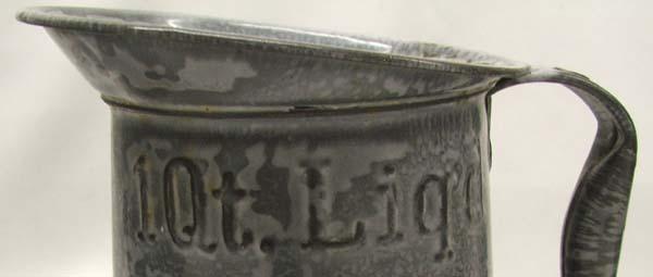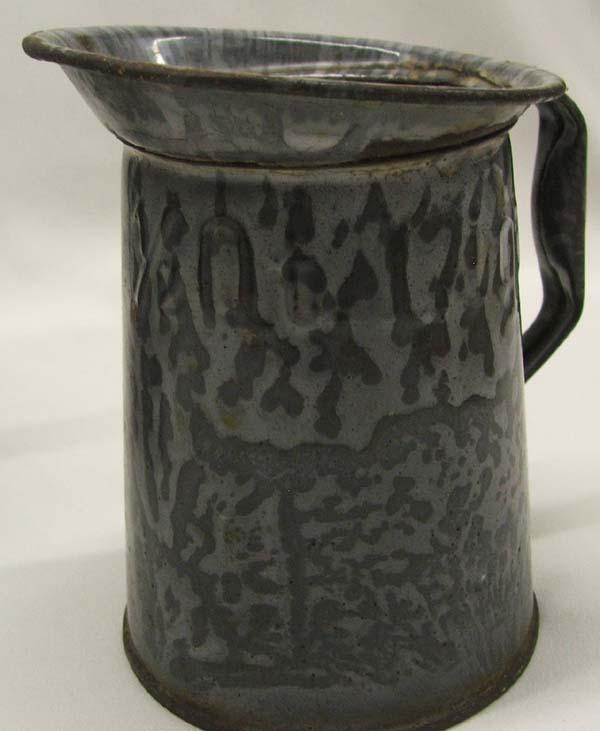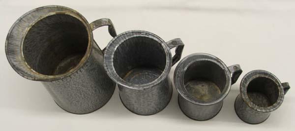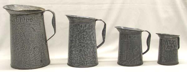 Set Of 4 Graduated Graniteware Measuring Pitchers. 1 Gallon Liquid, 2 Quart Liquid, 1 Quart Liquid, 1/2 Quart Liquid. Some chipping and rust. Largest pitcher measures approx. 9 1/4''H x 8'' x 6 1/2''. Buyers Pay Actual Shipping and Handling Charges(see terms and conditions for more information).
