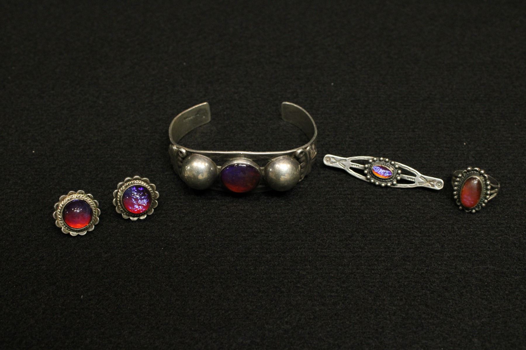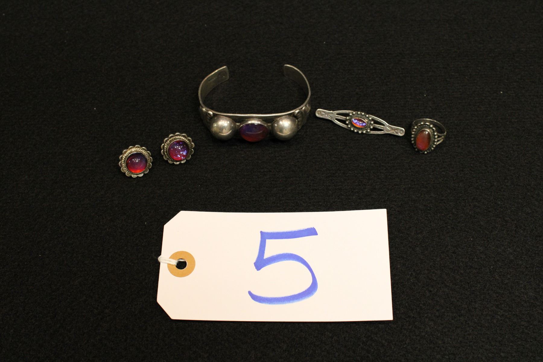 Opal ring, Fire Opal screw back earrings, bracelet and Fire Opal pin.