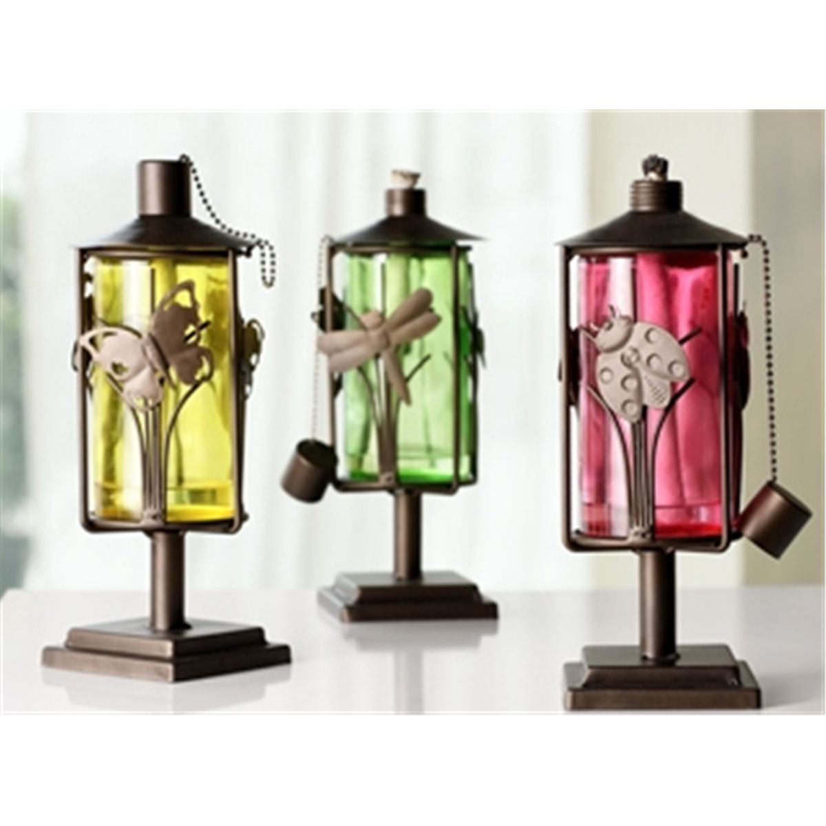Set Of Table Top Oil Lanterns (Butterfly, Dragonfly & Ladybugs - 11"H 4.5"W 4.5"D - Iron & Glass