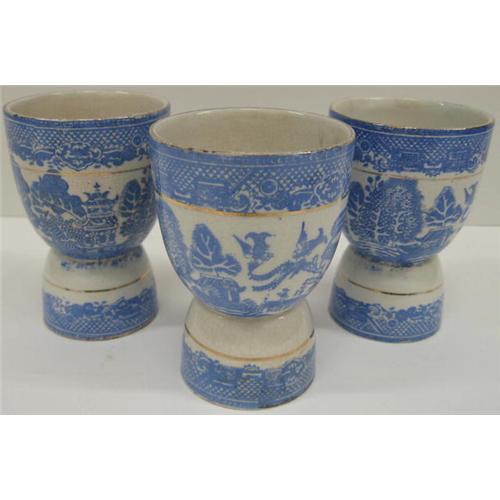 Three lovely eggs cups made of porcelain. Made by Blairs of England. Shows a Chinese village. 2 ½ inches wide x 4 inches tall. They are in great condition. 3 gold bands are on each cup and the rim. Wonderful addition to a collection,