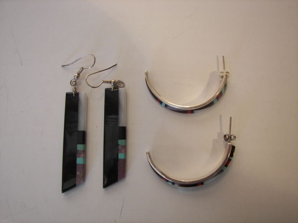 (7704) 2 Pairs Of Earrings. Turquoise, Jet Mother Of Pearl And Coral And Silver,