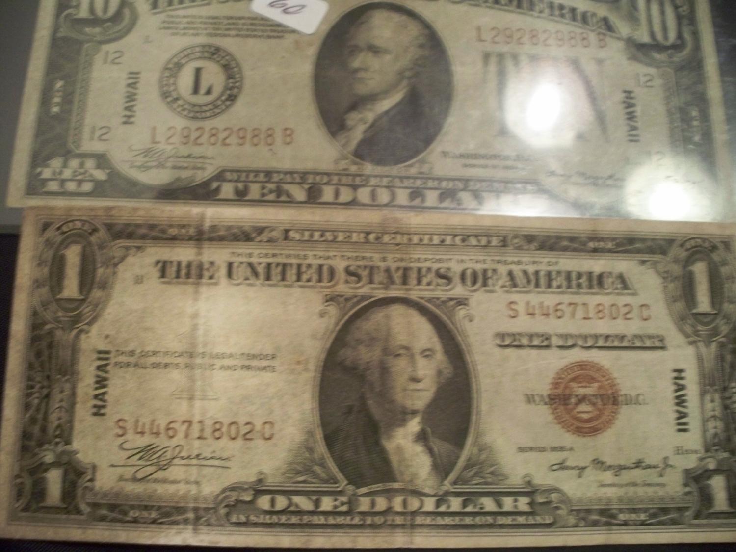 Set Of WWII Issue "Hawaii" $1, $5, $10, $20 Notes, $10 Graded