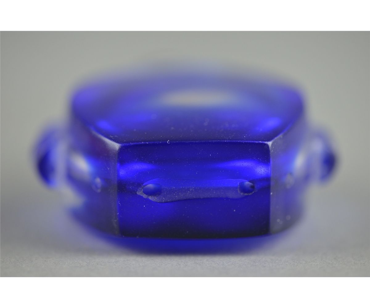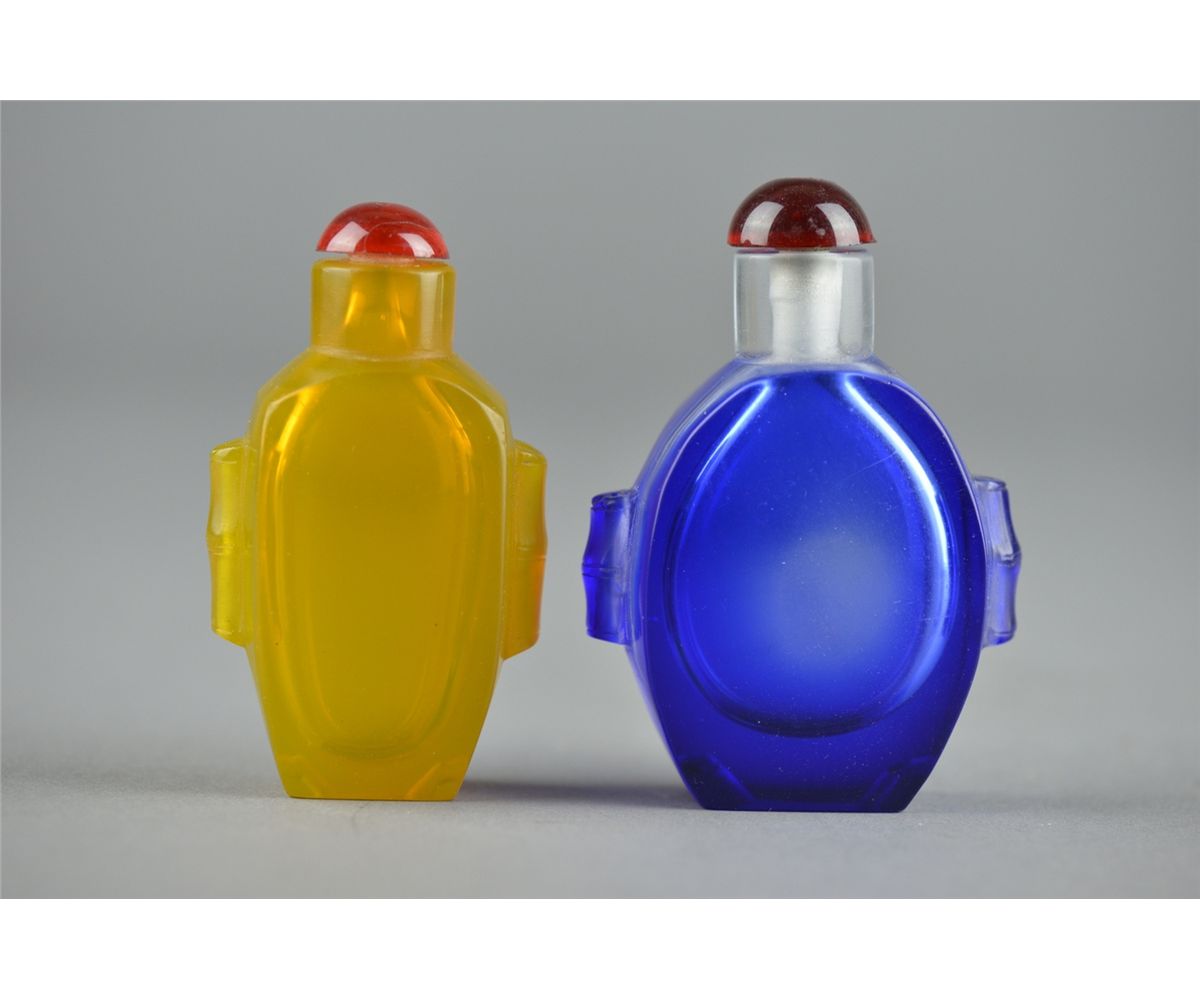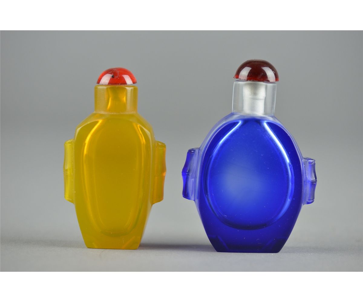 Set of two Chinese glass blue and orange snuff bottles; H: 7.5 cm (blue); H: 7 cm (orange)