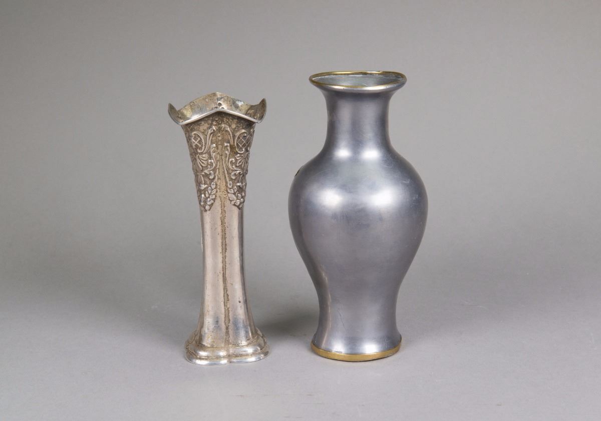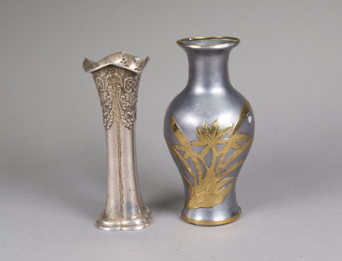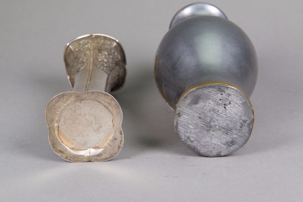 Set of two Chinese silver and zinc vases; H: 17 cm, D: 8 cm, 670 grams total; silver not tested for purity