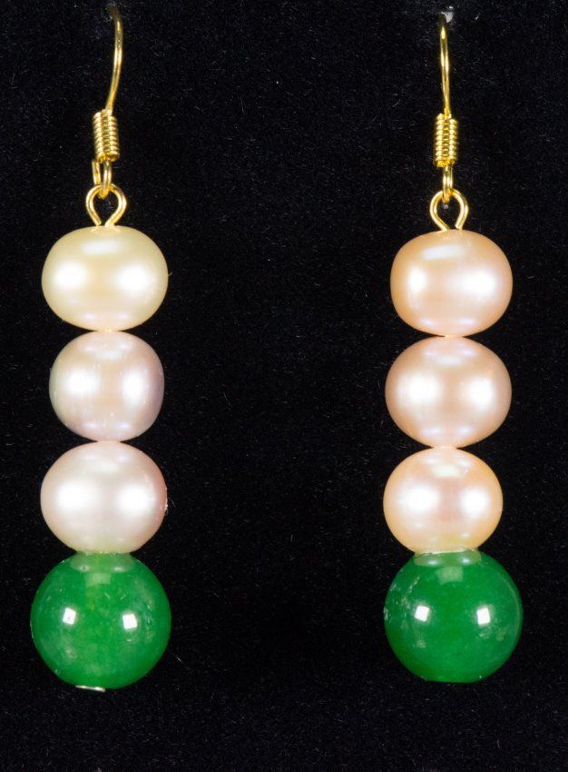 Pair of hardstone carved and pearl earrings; L: 3.2 cm, W: 0.8 cm, 8 grams (total)