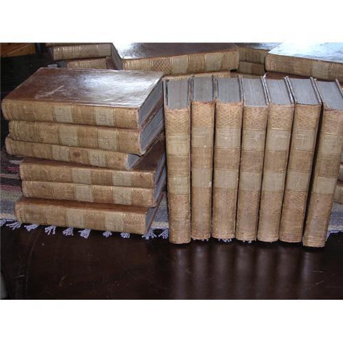 Set of fifty five "De Voltaire" vellum covered books. 1792-1802 Topics range from Theatre, Melanges, Romans, EssaI Sur, Histoire, Physique, Politique, etc.