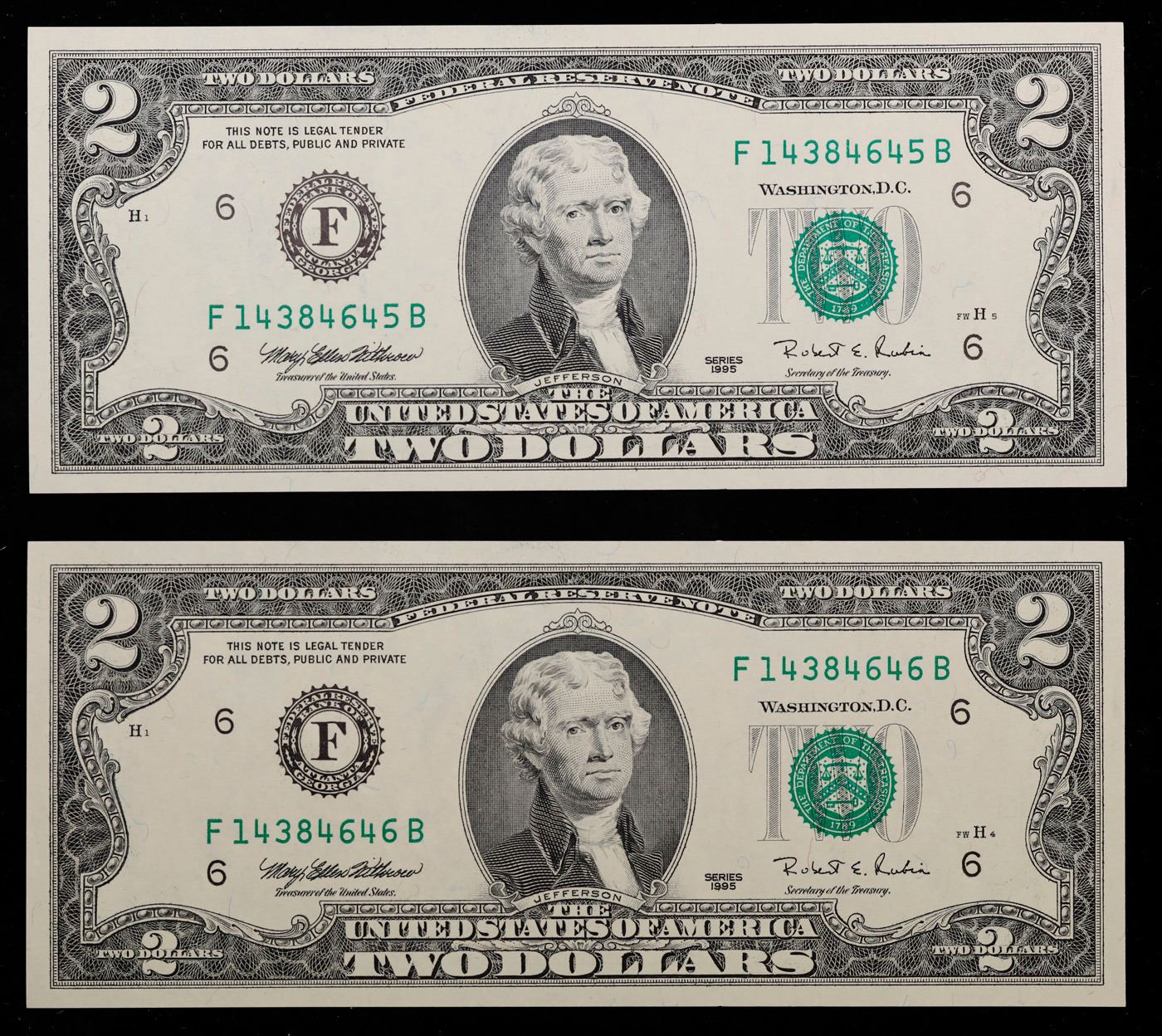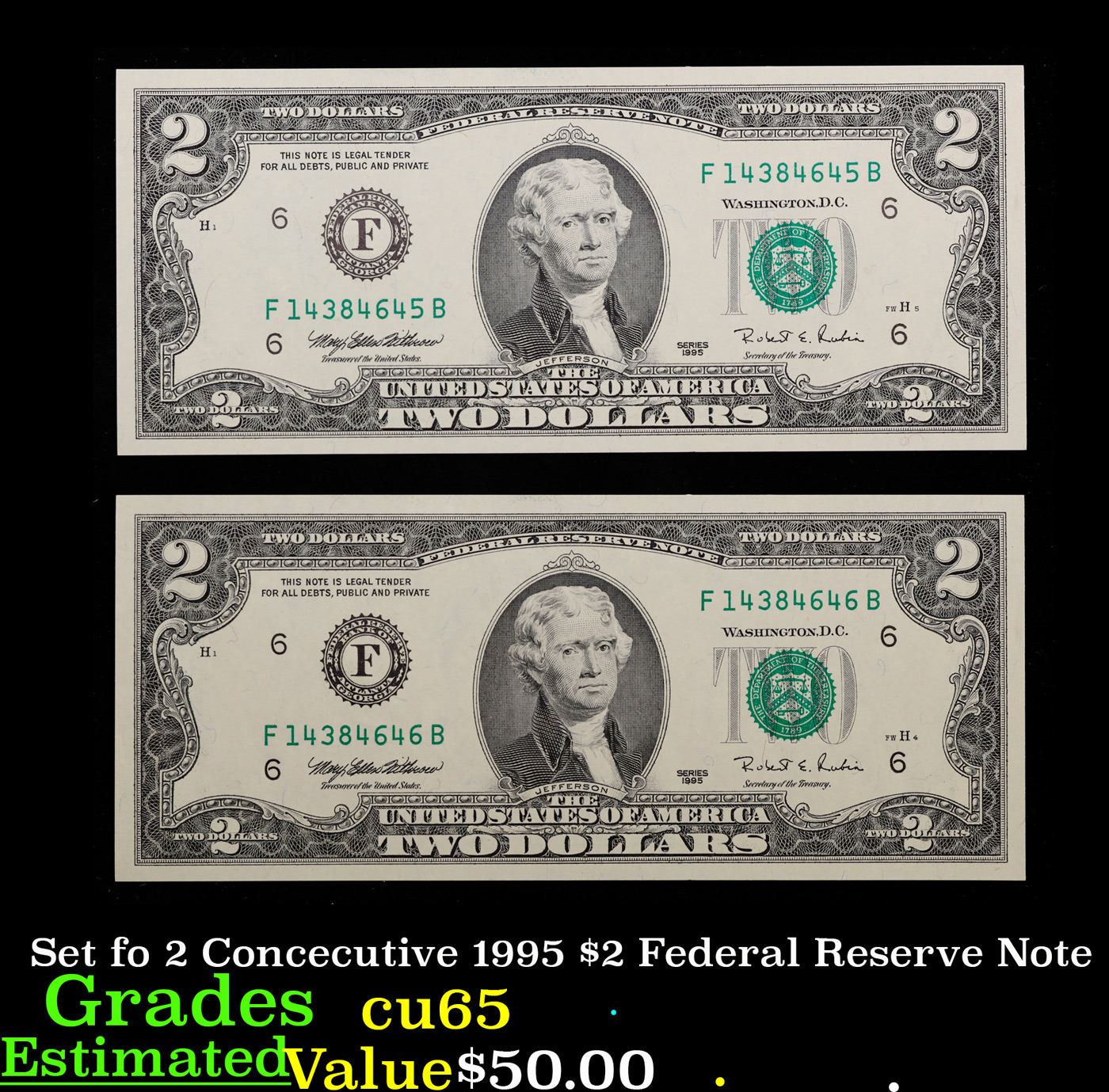 Set fo 2 Concecutive 1995 $2 Federal Reserve Note Grades Gem CU.
