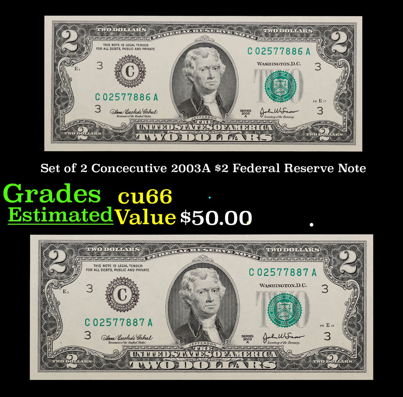 Set fo 2 Concecutive 2003A $2 Federal Reserve Note Low # Grades Gem+ CU.