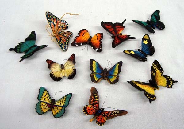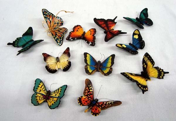 Set of 10 Butterfly Collection. Hand painted to match butterfly species. Some have magnetic backs, some have string for hanging. A Cloisonne Monarch hangs also. Largest 2.5''H x 3''W.