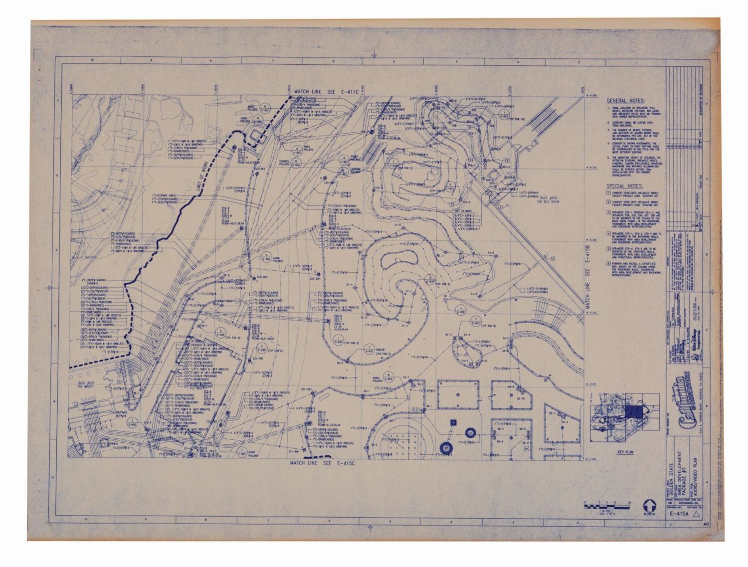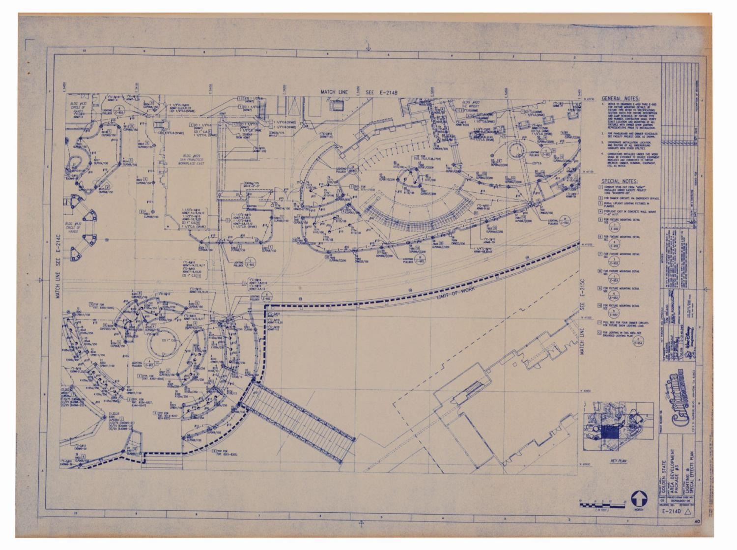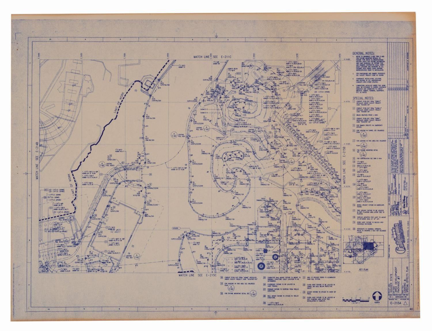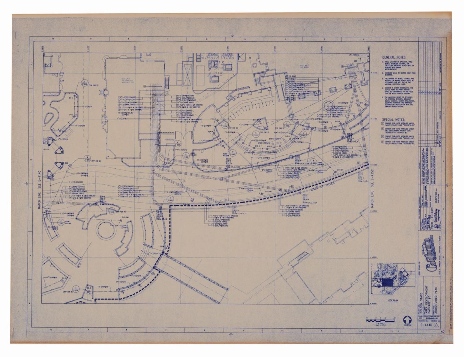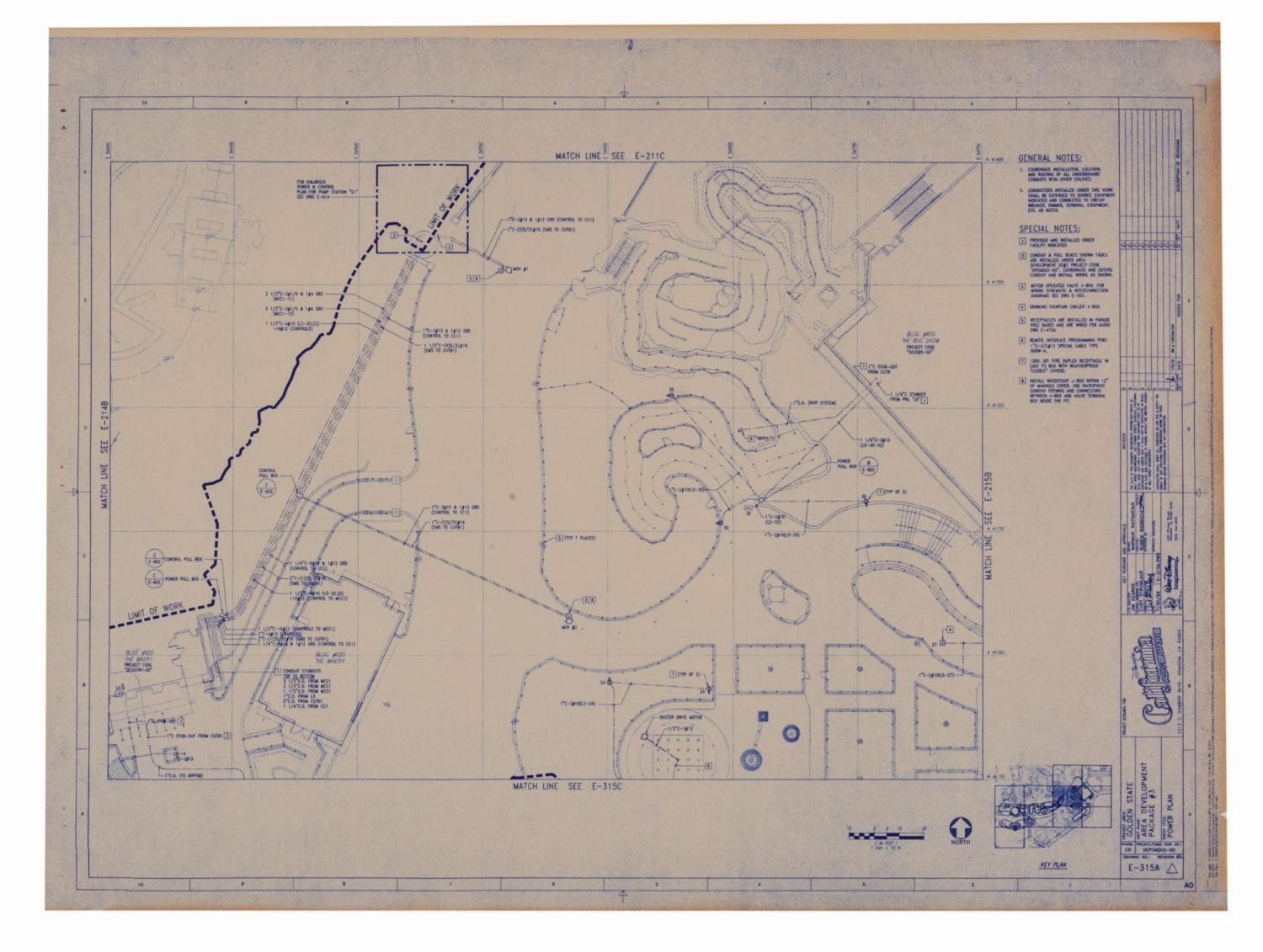 (California Adventure, 1999) A rare set of (10) construction blueline prints from California Adventure. These pre-opening technical prints provide a fascinating behind-the-scenes look of Golden State, one of the original four lands of the Park. Each blueline measures 18"x24" and the set is in very good condition with some handling wear and small spots of discoloration from use.