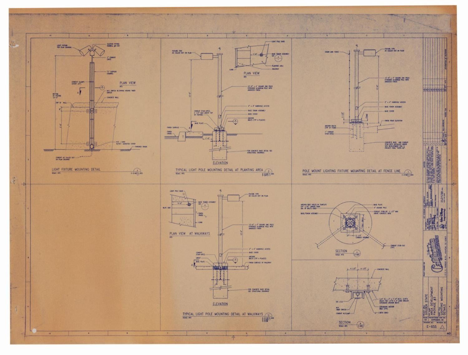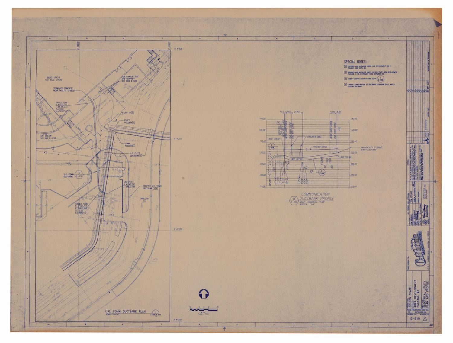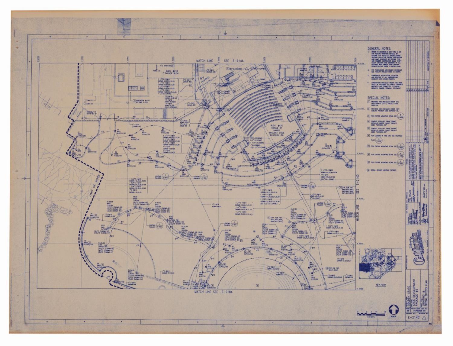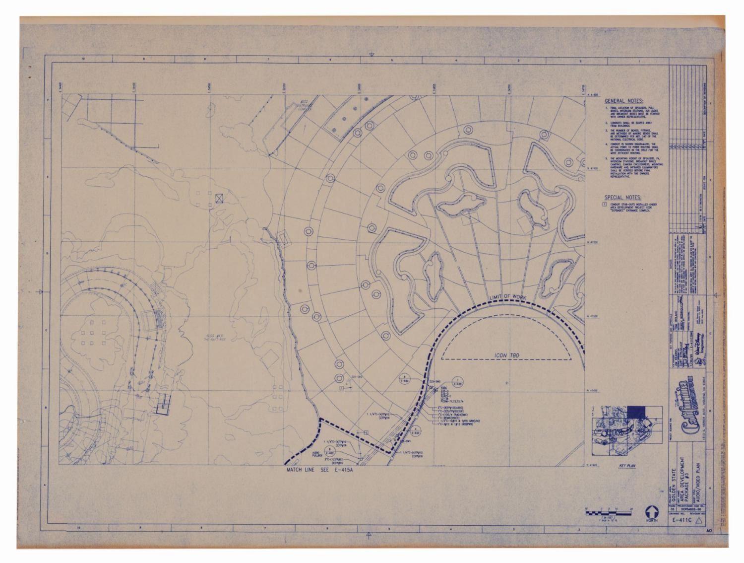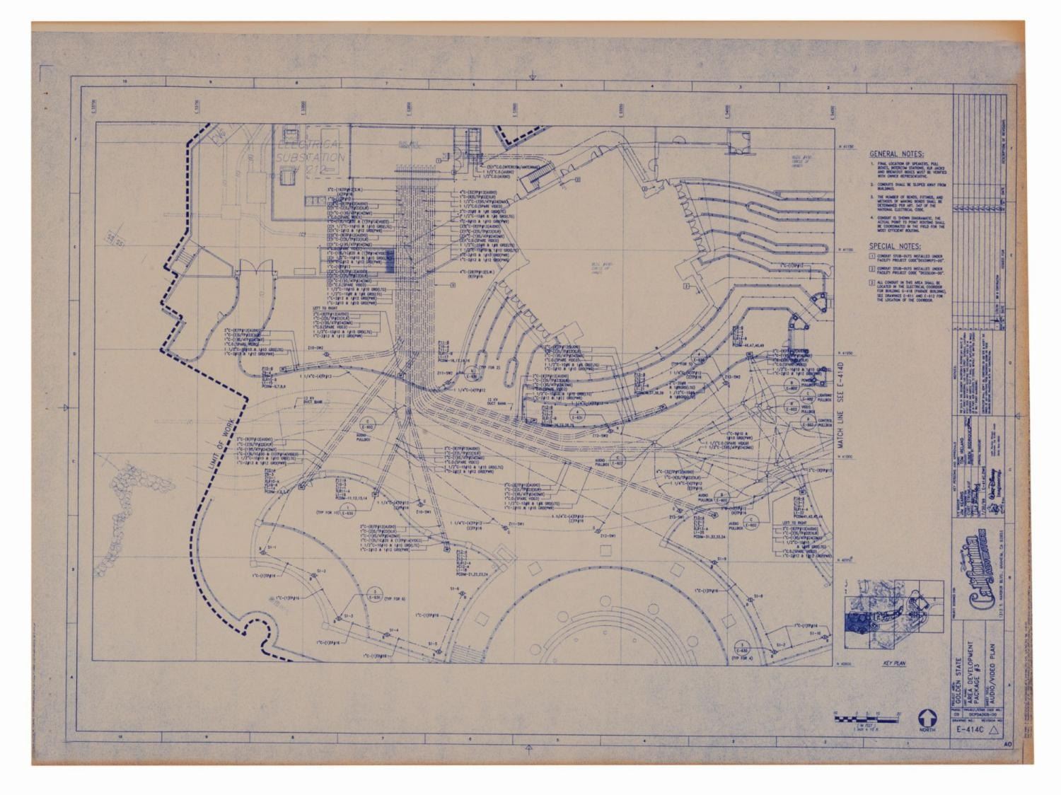 (California Adventure, 1999) A rare set of (10) construction blueline prints from California Adventure. These pre-opening technical prints provide a fascinating behind-the-scenes look of Golden State, one of the original four lands of the Park. Each blueline measures 18"x24" and the set is in very good condition with some handling wear and small spots of discoloration from use.