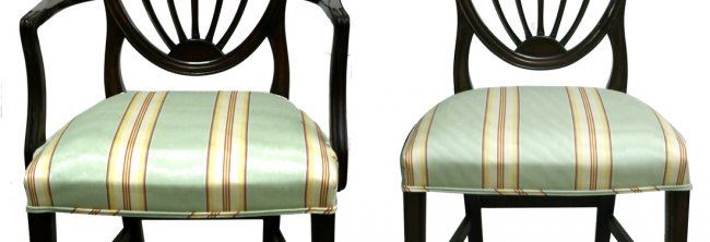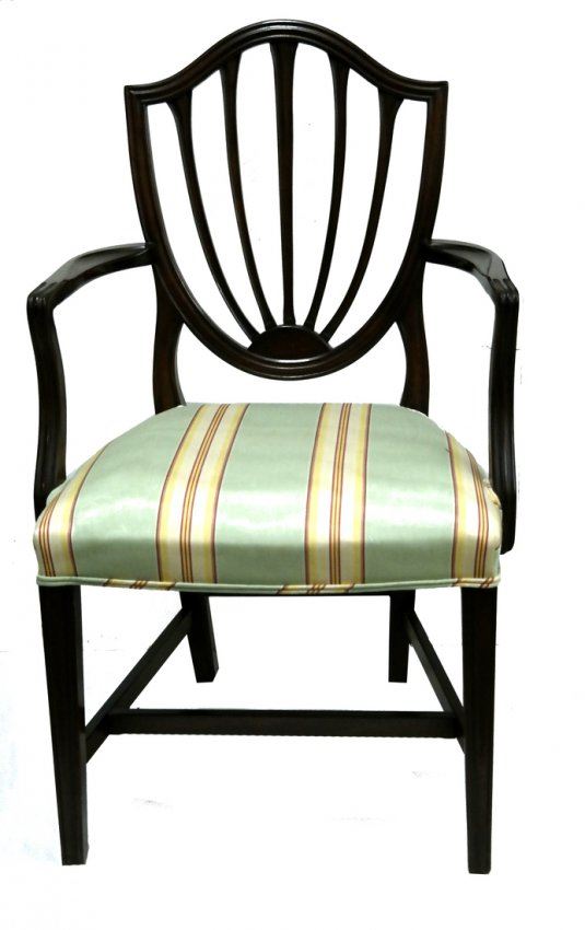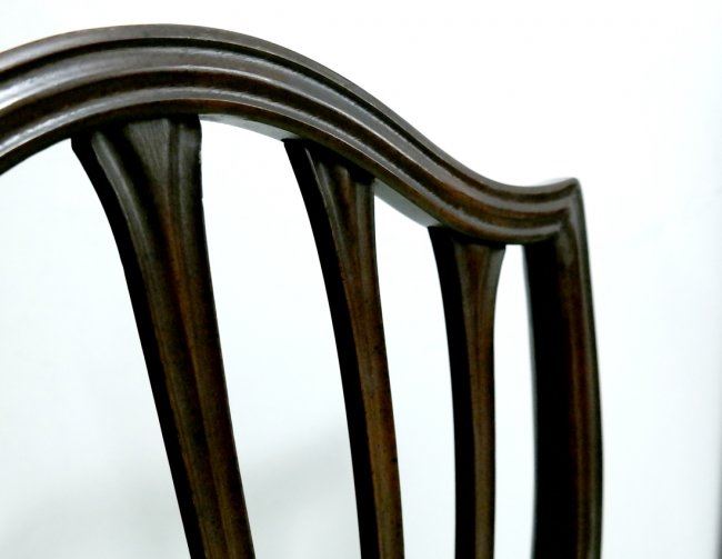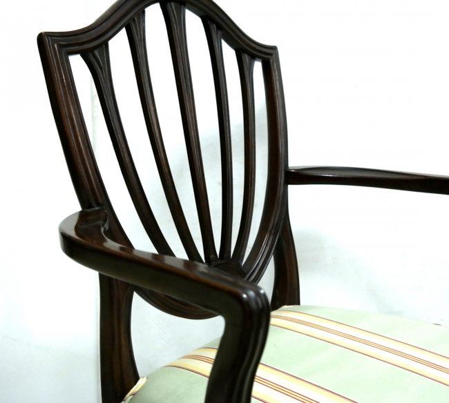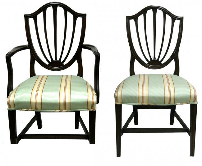Comprises two armchairs and eight side chairs. Mahogany shield back chairs with tapering square stock legs. [Armchair: 21" W x 18" D x 38 1/2"; 18" H to seat]. Light scratches.