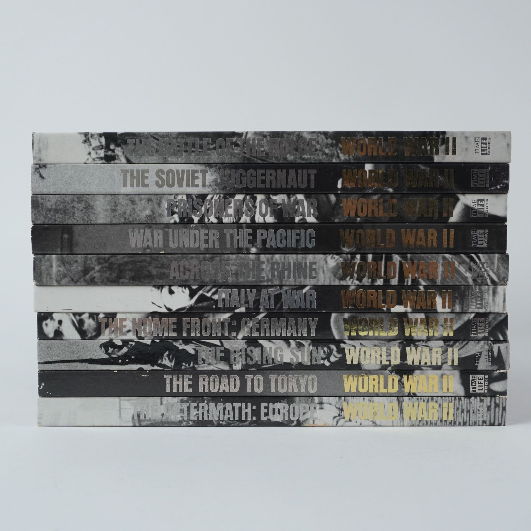 A compelling 10-volume collection from the Time-Life Books World War II series, each hardcover richly illustrated with historic photographs and detailed narratives chronicling key moments and themes from the war. Titles include: The Battle of the Bulge, The Soviet Juggernaut, Prisoners of War, War Under the Pacific, Across the Rhine, Italy at War, The Home Front: Germany, The Rising Sun, The Road to Tokyo, and The Aftermath: Europe. These volumes offer an accessible yet thorough examination of World War II, making them an ideal addition to any military history library or educational archive.