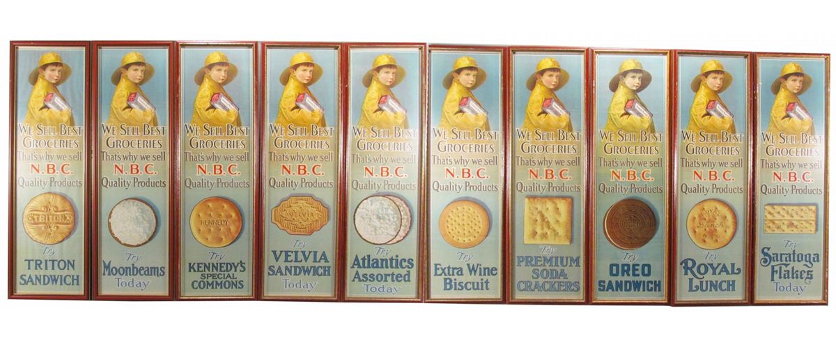 Set of 10 Uneeda Biscuits Advertising Signs. 10 unique products. "We Sell Best Groceries-That's why we sell N.B.C. Quality Products". All in excellent condition, framed under glass. 8 1/4 X 26 inches overall.