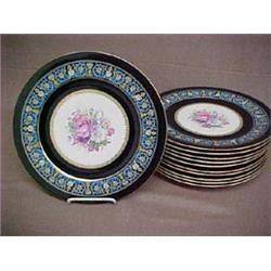 Set of twelve Bavarian service plates, with swirl and floral basket border on black ground, gilt rimmed center floral decoration on cream ground, marked on back Bavaria, and numbered, 10 3/4" d.