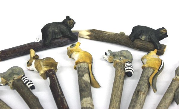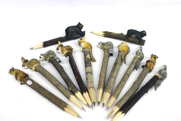 Set of 12 Carved Wooden Animal Pens. These sweet pens are carved from bass word and include chipmunks, racoons, squirrels, Bears, and Rabbits. They measure approx. 8''L x .75''W