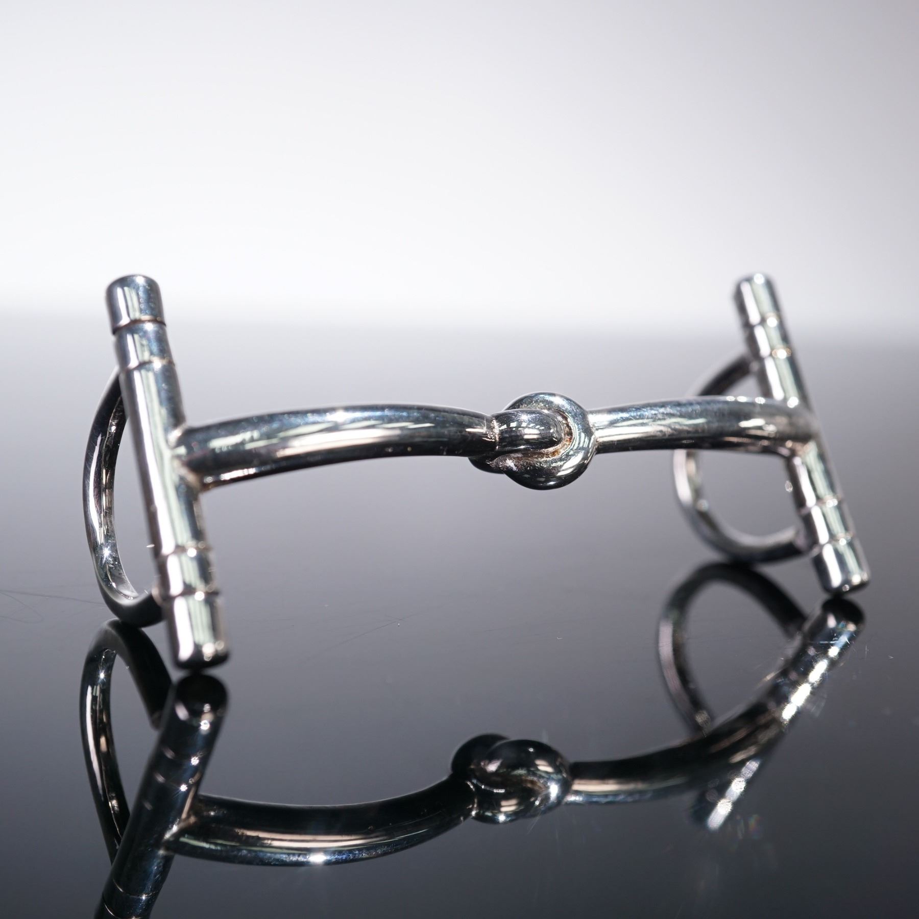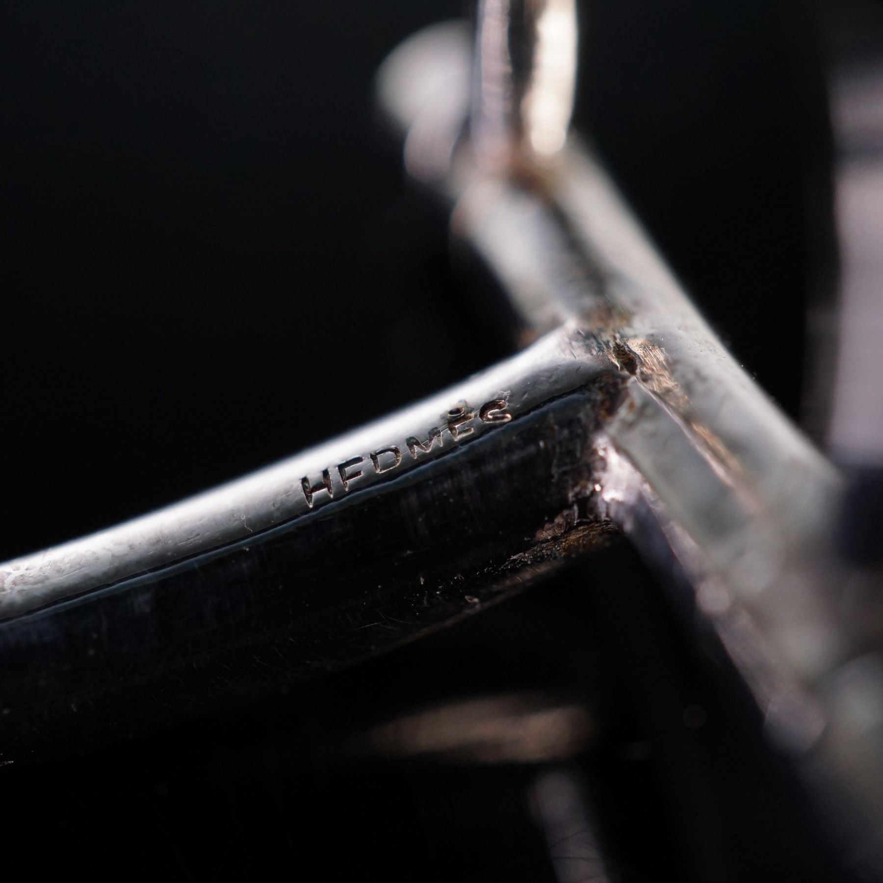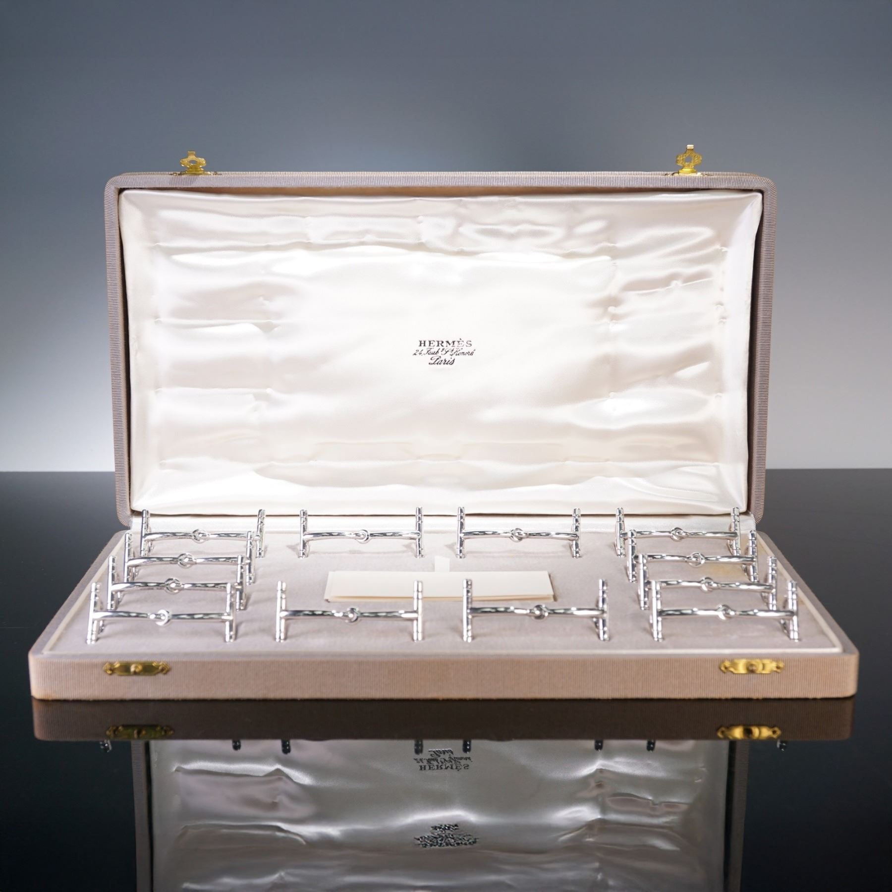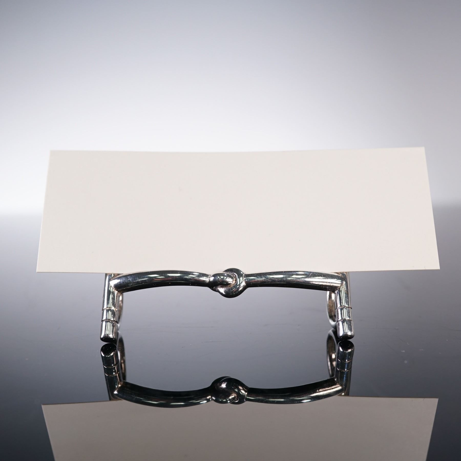 A luxurious set of 12 Hermes Paris silver plated place card holders, designed in the iconic equestrian snaffle bit motif. These versatile holders can be used for name tags, menus, or as knife rests, bringing refined elegance to any formal dining setting. The pieces are stamped Hermes and the complete set is presented in its original fitted case lined in silk, with the Hermes Paris logo. Unused paper tags accompany the set, further emphasizing its pristine condition. A beautiful example of Hermes craftsmanship that blends timeless design with function.