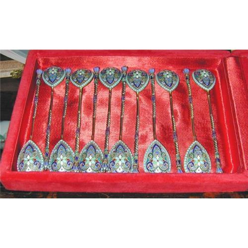 <tr><td>Title:Set of 12 Imperial Russian Enamel Spoons</td></tr>