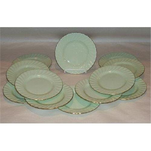 This is a beautiful simple pattern by Minton in a soft green, almost a sage green with gold trim. The pattern is called "Shell Green" and the pattern number is S612, made from 1948 through 1959. This is a set of twelve 6 1/4" bread and butter plates that look like new! They are marked on the bottoms; Minton Bone China, Made in England. and there is an impressed mark under the glaze that reads: Minton China 4/54, which I believe is the month and year these were made. The plates have a swirl border with gold rims. They are in excellent unused condition. A popular china replacement site lists these plates for $18.99 each. This is a set of 12 for one price!