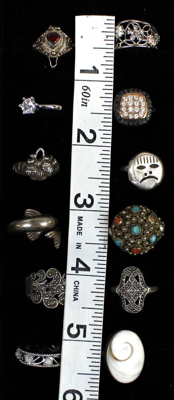 Set of 12 Sterling Silver Rings, the first ring is a poison ring. Sizes, rows going across. Row #1 1. sz6 2. sz6.5 Row #2 1.Sz6 2. sz6 Row 3 1. sz6 2.sz5.5 Row 4 1.sz72.sz 7 Row 5 1.sz 5 2.sz7.5 Row6 1. sz7 2.6.5