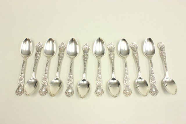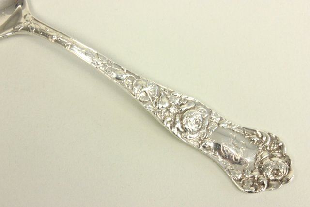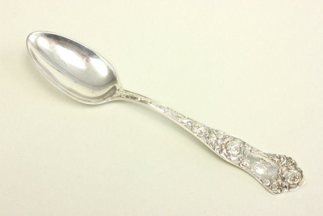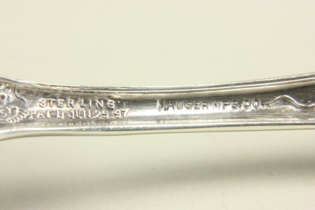 George Shiebler Mauser MFG Co., " American Beauty" pattern, all monogramed. Approx 6 1/8" L, 11.78 ozt, 366 g. (3449.12) Good condition.