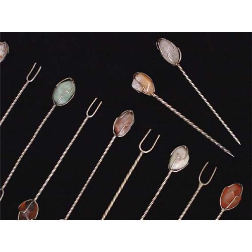 Lovely set of silver and polished, semi-precious stones cocktail picks, 14 units in total. These hand-crafted items are unmarked but are usually made of silver, not silver plate. In good used condition as shown. Please ask questions, request additional photos and shipping costs before buying.