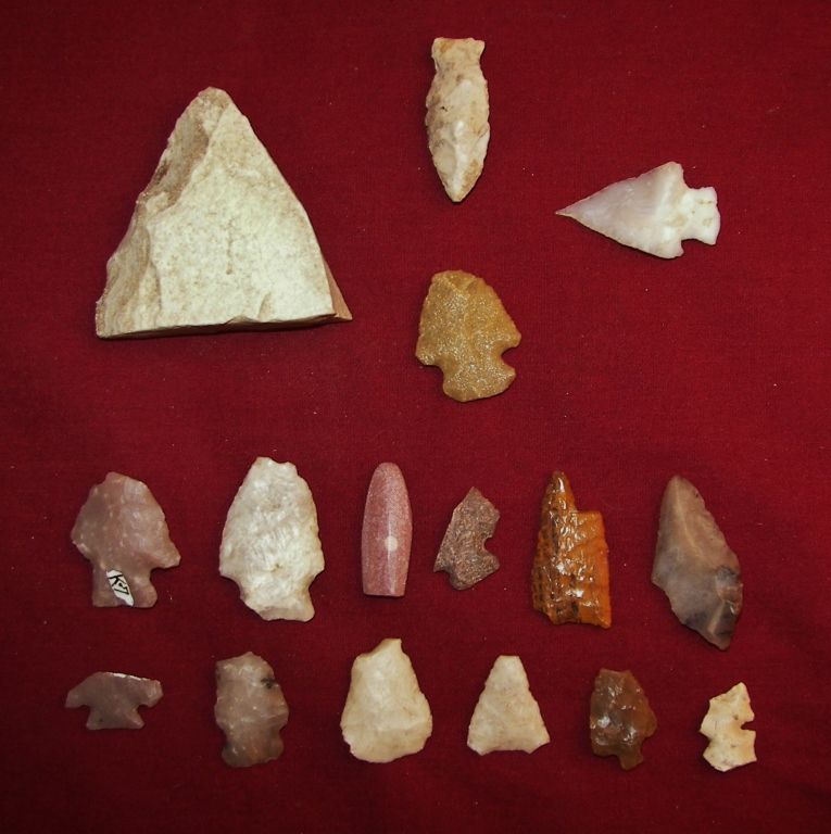 Set of 16 Various Points; War Club Implant, Desert Set of 16 Various Points; Bradley, Light Tan Chert, 15mm x 36mm, Desert Corner Notched Very Nice Example, Whitish Agate, Needle Point, 20mm x 34mm Desert Corner Notched, Light Brown Quartzite, Point Ding, War Club Implant, 2' x 2" 12 Damaged Colorado Arrowheads, Various,