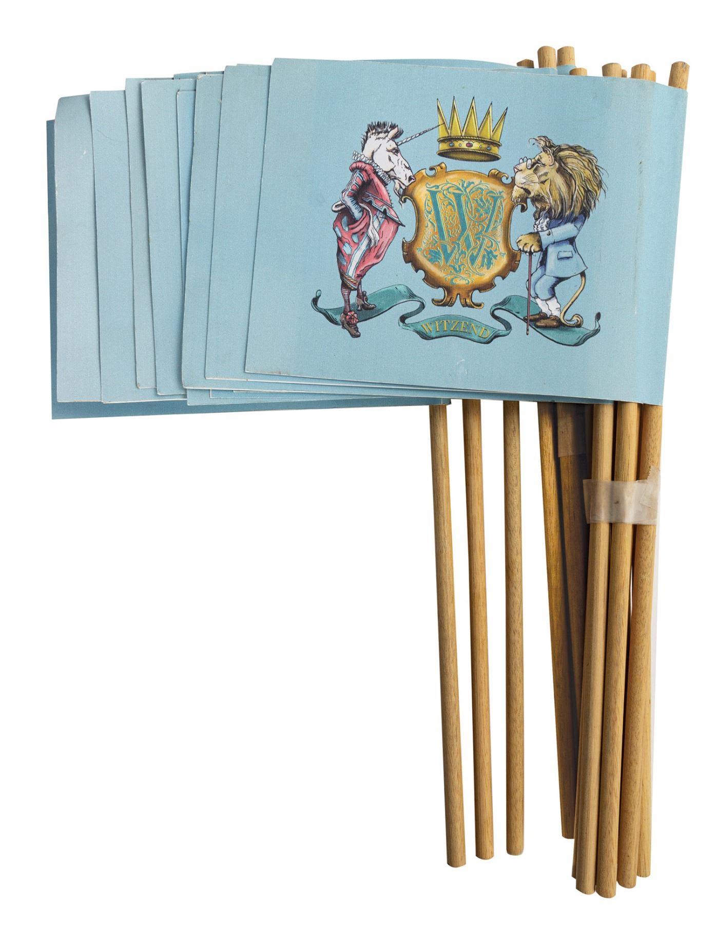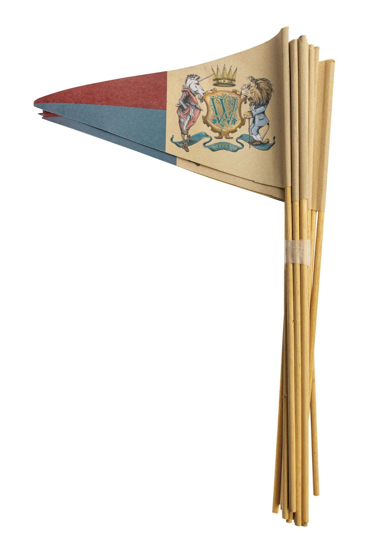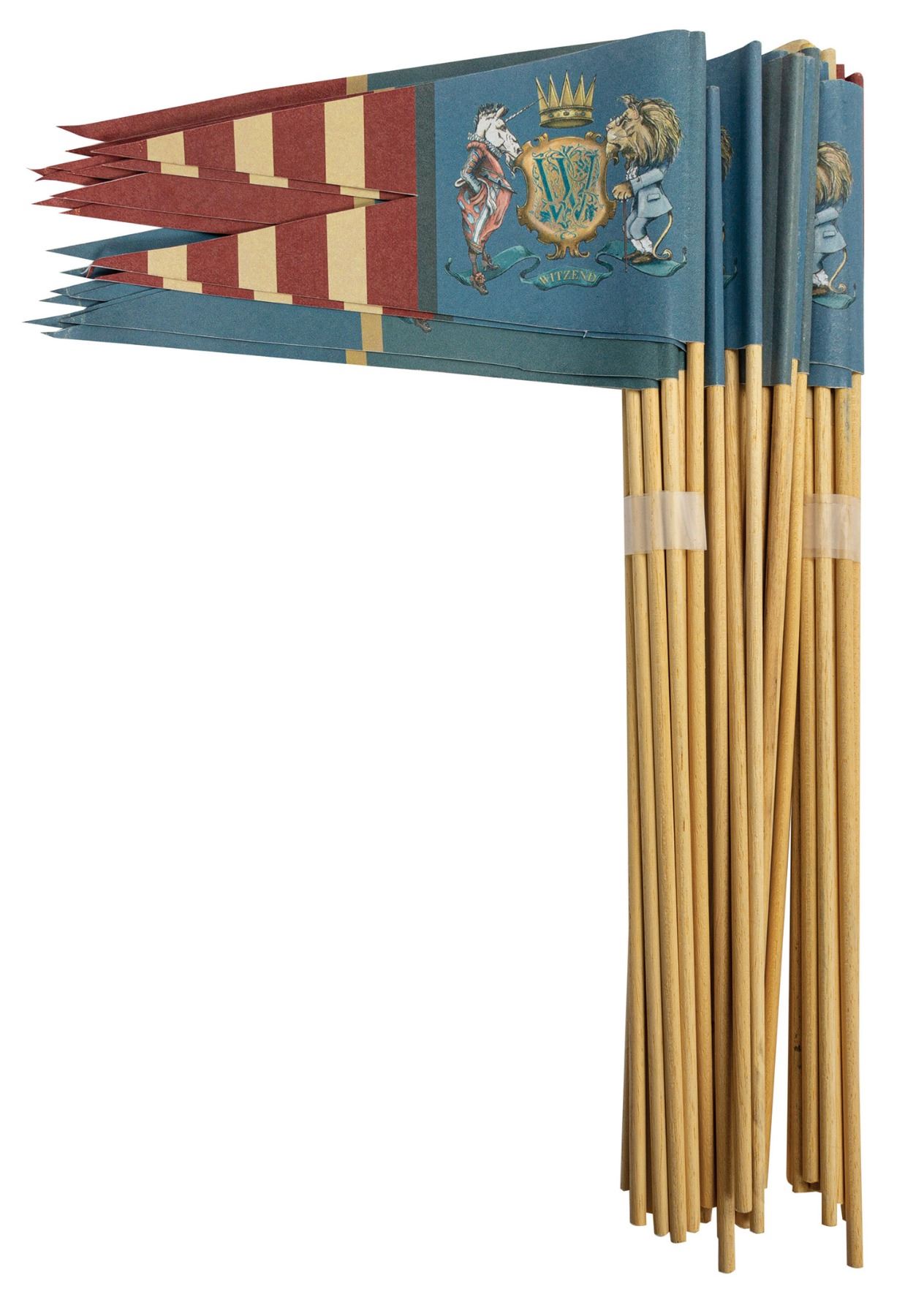 (Disney, 2016) A collection of (184) prop flags from the film, Alice Through the Looking Glass. These flags were used in the market scene and feature crest imagery for Witzend. The flags measure approximately 9" long, with 16" tall wooden dowels. The condition is good with minor creasing from use.