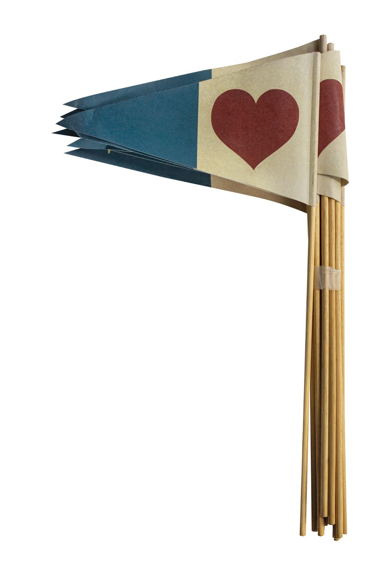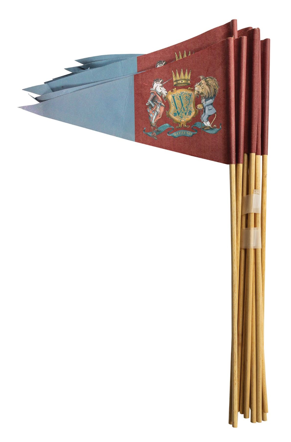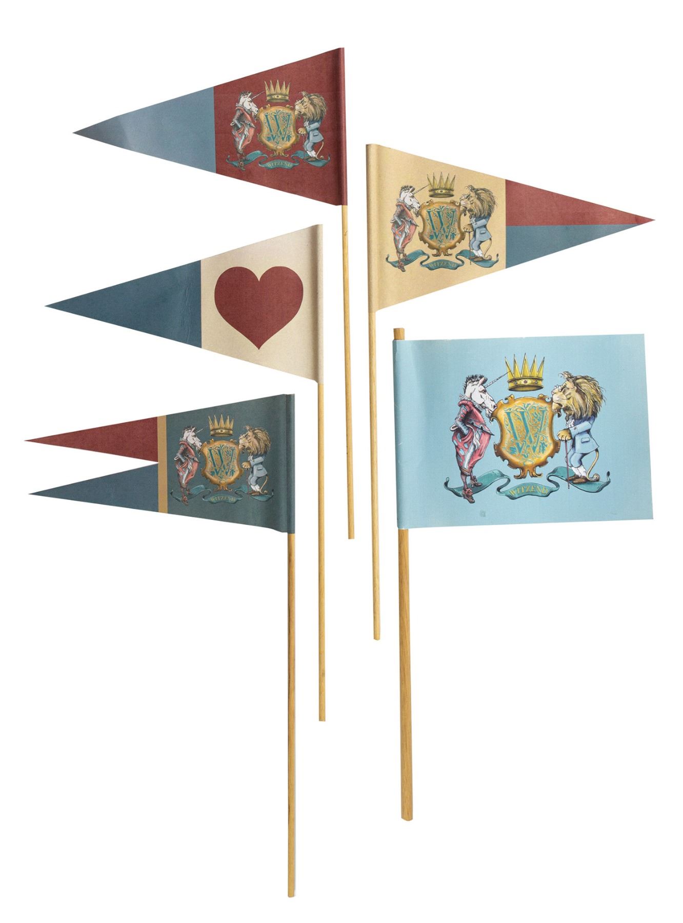 (Disney, 2016) A collection of (184) prop flags from the film, Alice Through the Looking Glass. These flags were used in the market scene and feature crest imagery for Witzend. The flags measure approximately 9" long, with 16" tall wooden dowels. The condition is good with minor creasing from use.