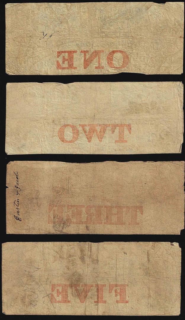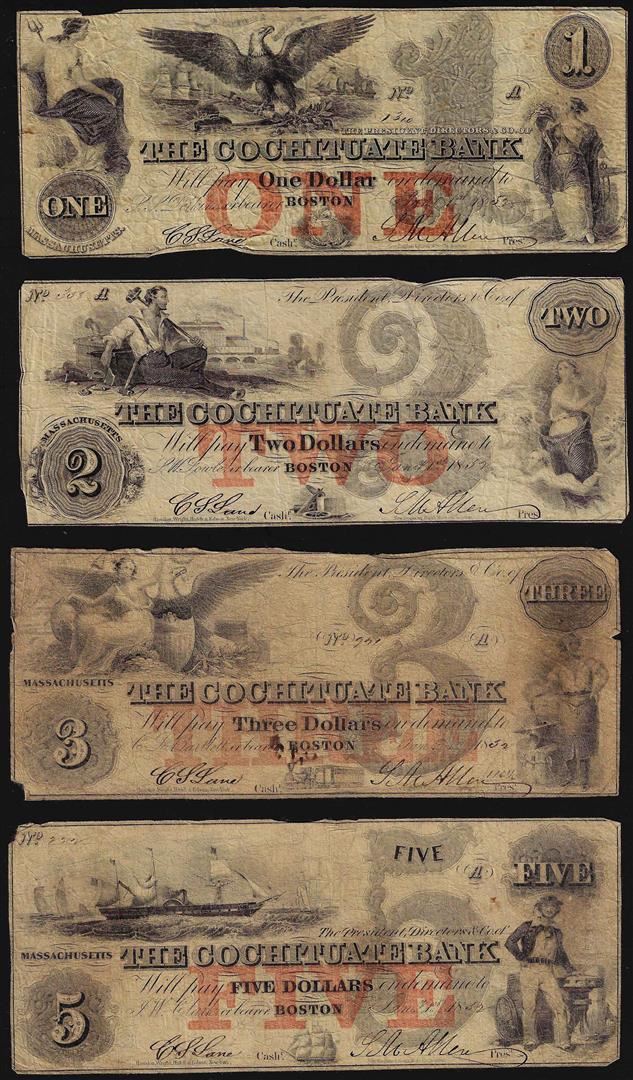 One Set of 1852 $1/2/3/5 The Cochituate Bank Obsolete Notes.
