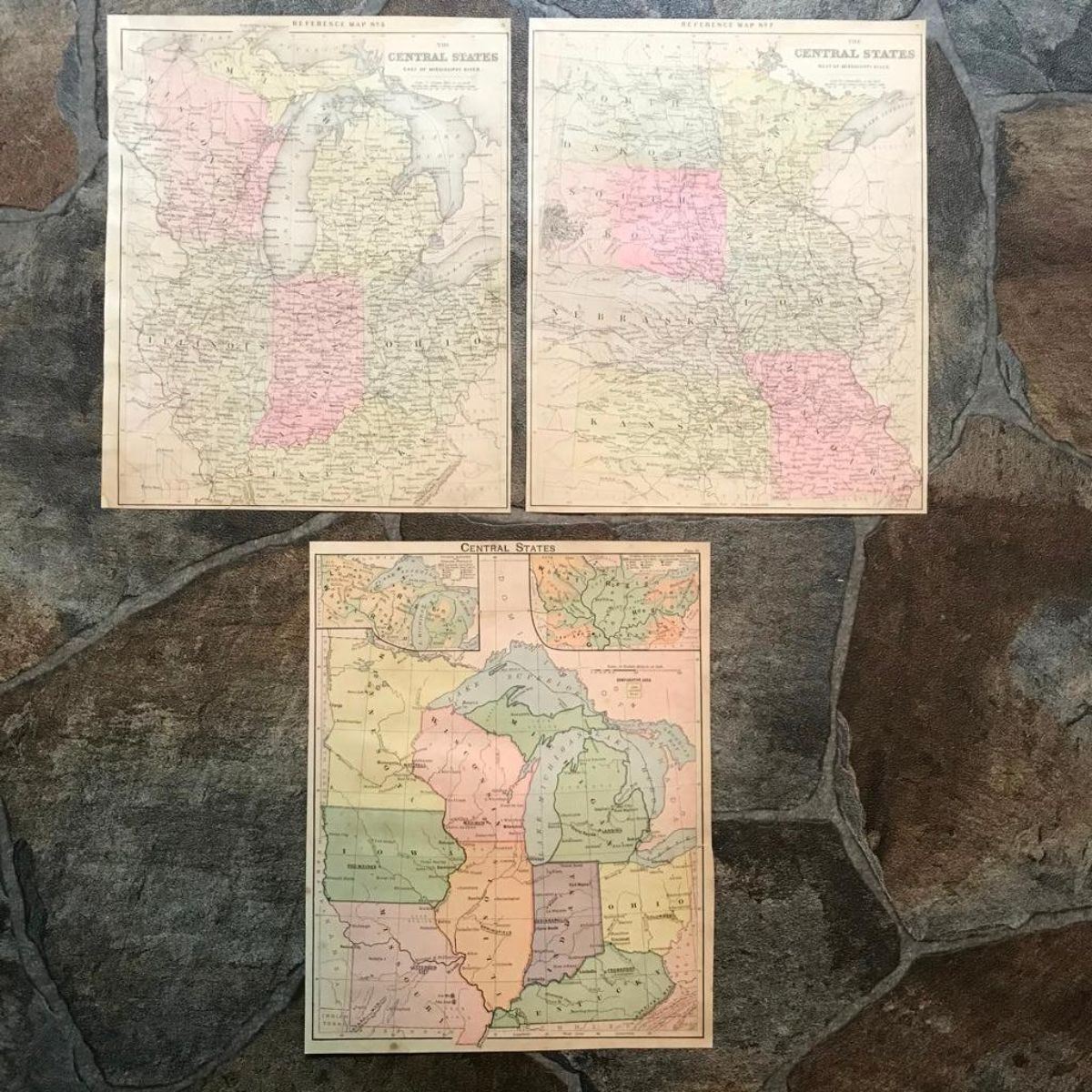 Set of three maps of The Central States, c.1890's, printed by the American Book Company in the Grammar-School Geography - Physical, Political, & Commercial book by William Swinton. States including Wisconsin, Michigan, Ohio, Indiana, Illinois, Kentucky, North Dakota, South Dakota, Minnesota, Nebraska, Iowa, Missouri, Kansas, Minnesota, Wisconsin & Iowa. Approx 9" X 11 1/4" each.Â
