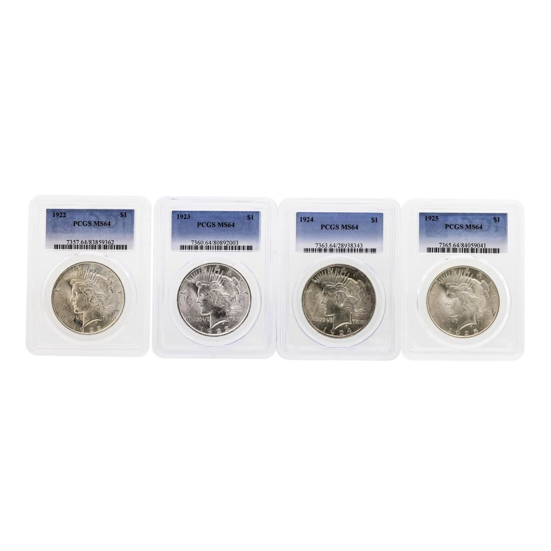 One Set of 1922-1925 $1 Peace Silver Dollar Coins NGC MS64. NGC Certified.