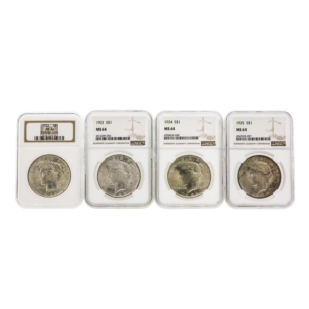 One Set of 1922-1925 $1 Peace Silver Dollar Coins NGC MS64. NGC Certified.