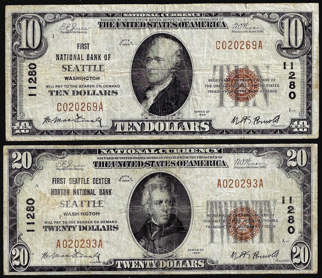 One Set of 1929 $10/$20 First NB of Seattle, WA CH# 11280 National Currency Notes.